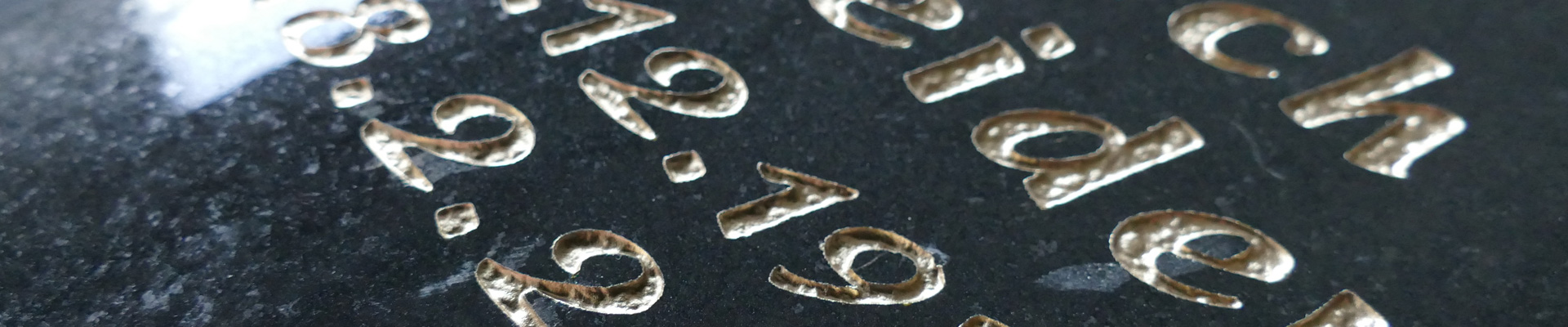 Eine Grabplatten-Beschriftung wird entweder in den Stein graviert (hochwertige Sandstrahlgravur), geschlagen oder als Metallschriftzug aufgesetzt. Bei der ersten Variante erstellt der Steinmetz eine Sandstrahlgravur Ihrer Inschrift, die 2-3 mm tief in den Stein eingearbeitet und anschließend mit Ihrer Wunschfarbe ausgelegt wird.